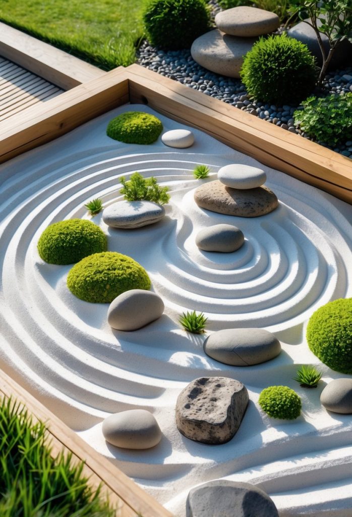 You can add calm to your front yard by making a mini Zen garden. Use a shallow container filled with sand or fine gravel. Then, place smooth stones carefully to create a peaceful look. It’s simple and brings a quiet, natural feeling to your space.