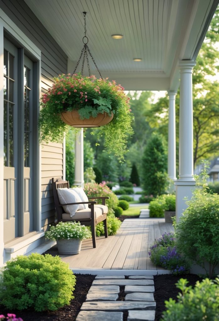 You can brighten your porch by adding a hanging garden planter. It saves space and brings plants closer to eye level.