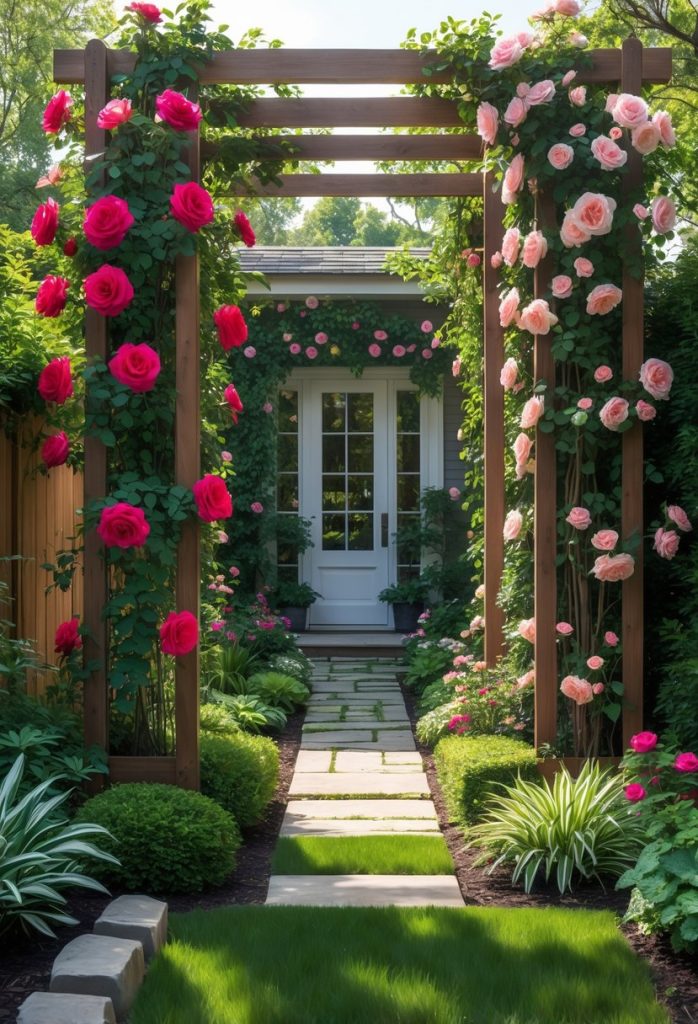 You can save space by using vertical trellises in your small front yard. They give climbing roses the support they need to grow tall and look nice. Plus, trellises add a lovely vertical element that brightens up your yard without taking much ground space.