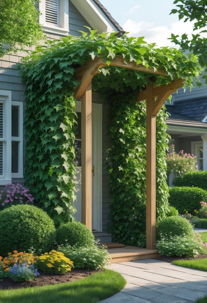 You can add charm to your small front yard by growing trailing ivy on a trellis. Ivy climbs easily and fills vertical space with green leaves.