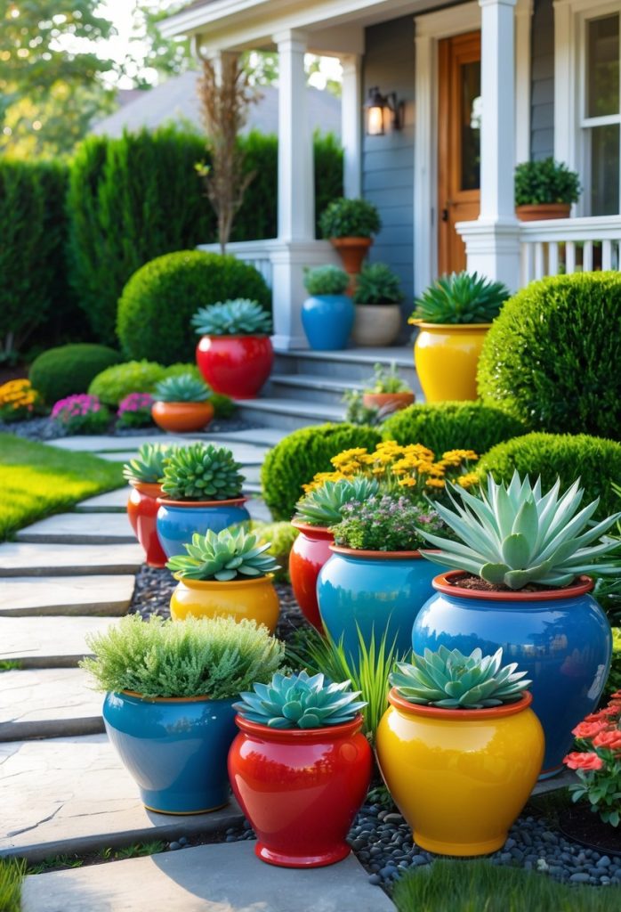 You can add fun and energy to your front yard by choosing decorative pots in bright colors. These pots catch the eye and make your plants stand out.