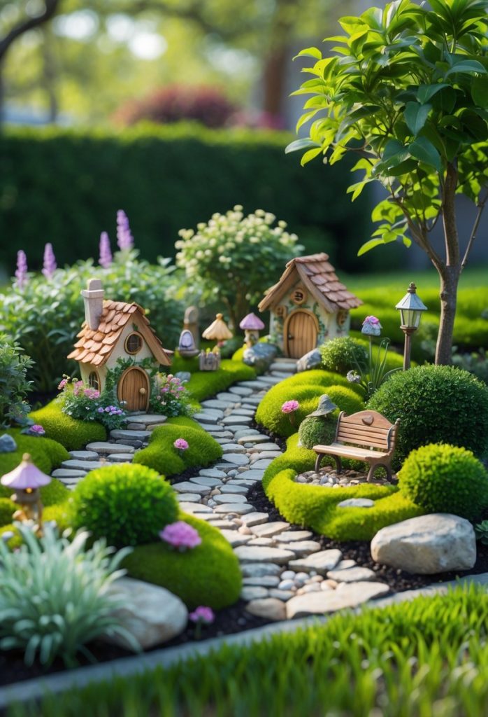 You can add charm to your front yard by making a small fairy garden. Use tiny houses, miniature plants, and little figures to build a magical scene.