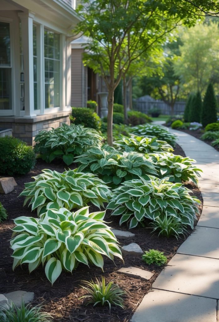 You can brighten shady spots in your yard with variegated hostas. Their striped or spotted leaves add interest and light to darker spaces. They stay low-maintenance and thrive in shade, making them a smart choice for a small front yard.