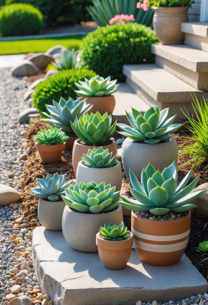 You can brighten your front yard with succulents in pots. They need little water and care, so they’re easy to keep healthy.