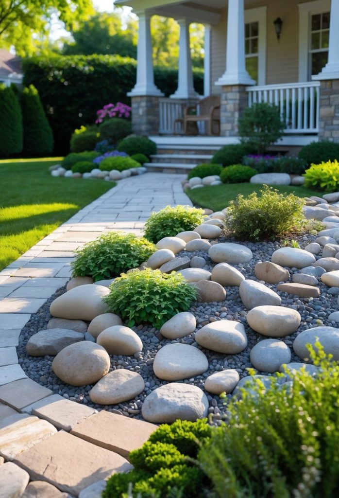 You can use a small rock garden to catch attention in your front yard. Arrange stones with some drought-tolerant plants to keep it low-maintenance. This adds texture and interest without needing much water or care.