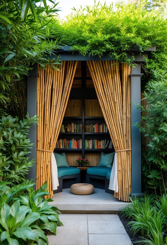 Create a secluded reading spot by hanging bamboo curtains around a cozy corner of your garden. These natural screens provide shade and privacy while allowing gentle breezes to flow through.