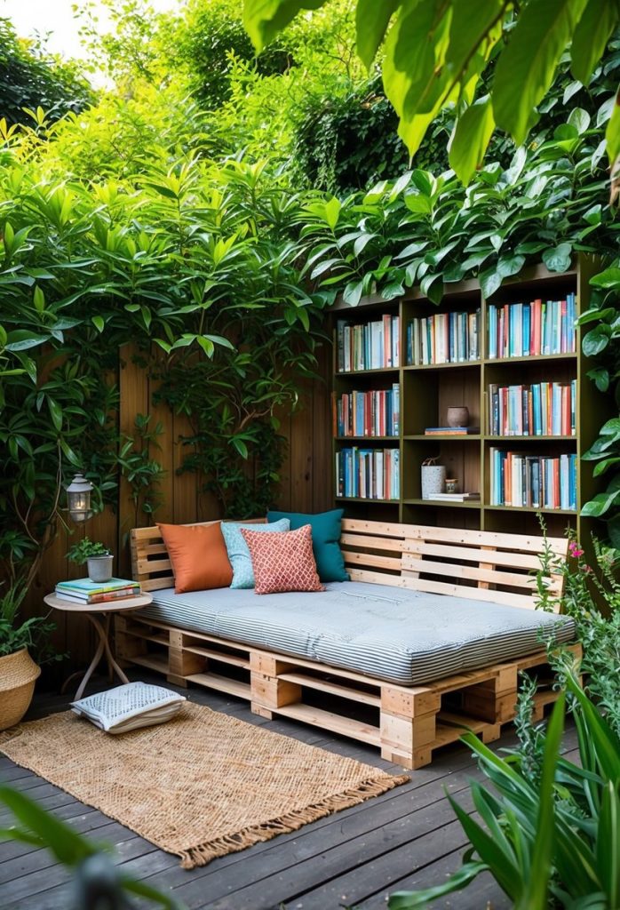 Transform old wooden pallets into a comfortable daybed lounge for your garden library space. Stack and secure several pallets to create the base, then add a weather-resistant mattress and pillows.