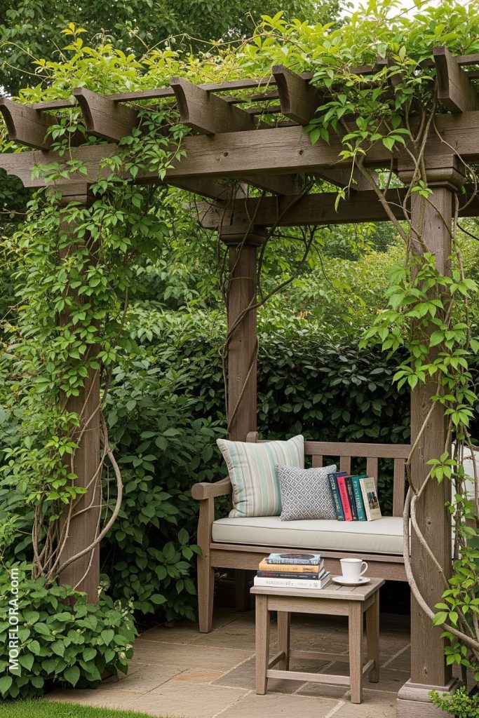 You can create a cozy outdoor reading nook by adding a pergola covered with climbing vines. The plants provide natural shade and keep the space cool.