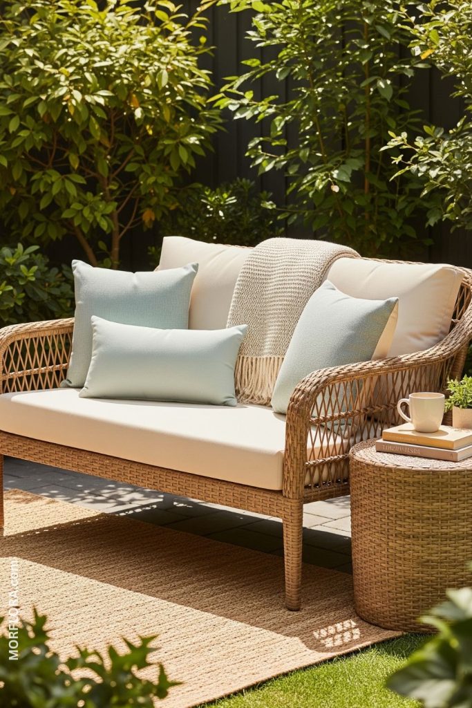You can add a rattan loveseat to your outdoor reading nook for a cozy feel. The weatherproof fabric keeps it safe from rain and sun.