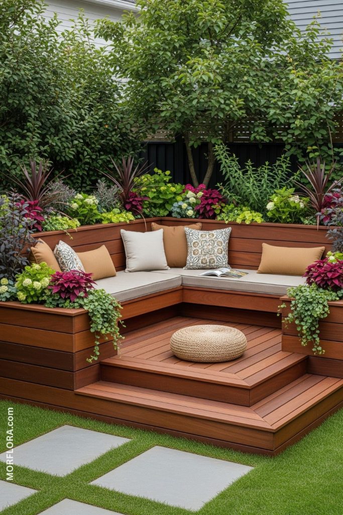 You can create a cozy reading spot by adding built-in seating to your raised deck. This saves space and gives you a comfy place to sit.