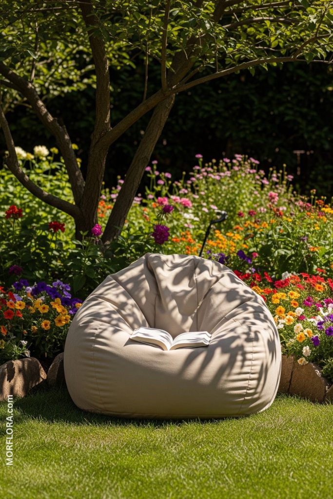 Place a soft outdoor bean bag chair close to your flower beds for a peaceful reading spot. The colors and scents of the flowers add to the calm atmosphere.