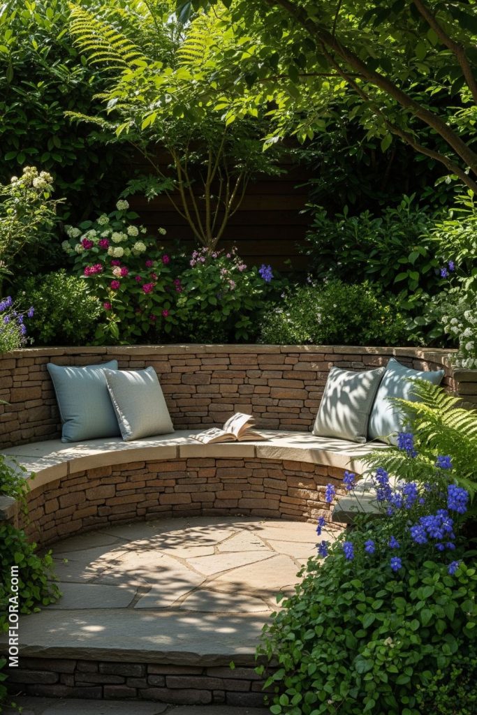 You can create a cozy outdoor reading spot by adding built-in stone seating. Surround it with plants to make the space feel peaceful and natural.