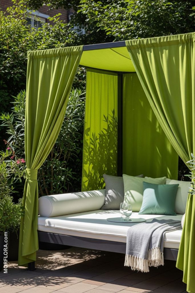 You can create a calm spot by adding a daybed with a canopy outside. The canopy gives shade, so you stay cool while reading or resting.