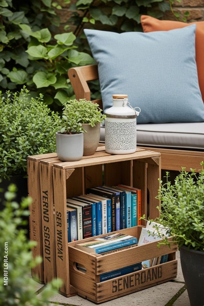 You can use a wooden crate as a simple side table for your reading nook. It gives a rustic feel and a place to keep your books close by.