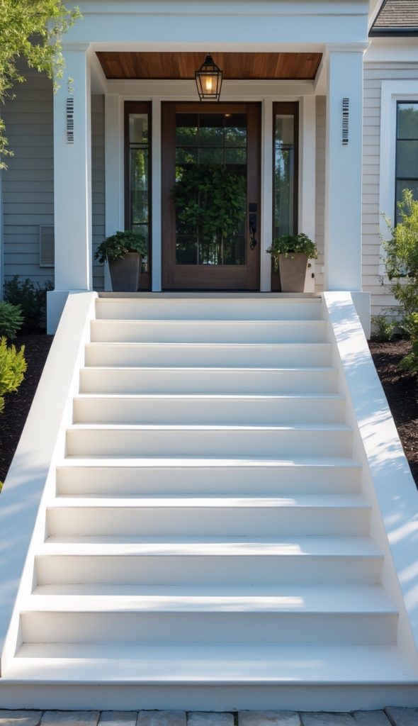 You can use all-white paint for your outdoor stairs to create a clean, fresh look. White stairs reflect light and make your entrance feel brighter. This works well if you want a simple style that matches many home colors. White also helps smaller spaces seem more open.