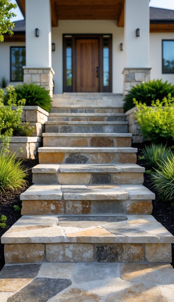 You can choose natural stone steps with textured surfaces to add grip and safety. These stones also bring a rustic, earthy feel to your entrance. Textured surfaces make the steps less slippery when wet, which is useful for outdoor use.