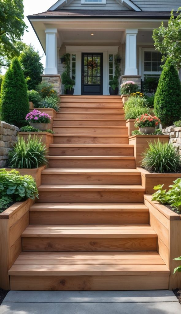 You can add charm to your entrance with broad wooden steps that include built-in planters. These planters let you grow flowers or small shrubs right on your stairs. This design gives your home a warm and natural look while saving space.