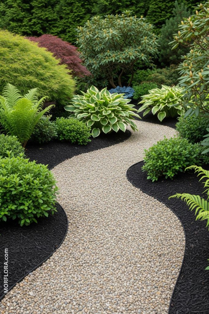 You can line your pea gravel path with low-maintenance shrubs for a clean, simple look. These plants need little care and won’t crowd your walkway. This setup helps keep your garden tidy without much effort.