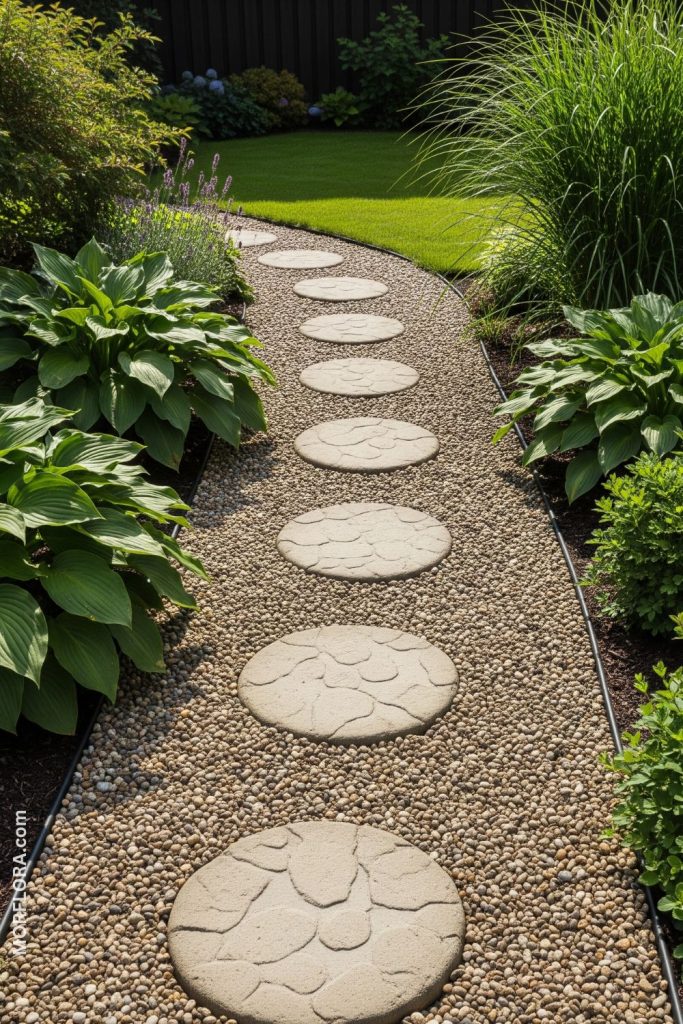 You can create a simple, charming path by pairing pea gravel with stepping stones. The gravel fills spaces around the stones, giving your walkway a neat and natural look. This combo also helps keep your shoes clean by providing solid spots to step on. It’s easy to install and fits many garden styles.