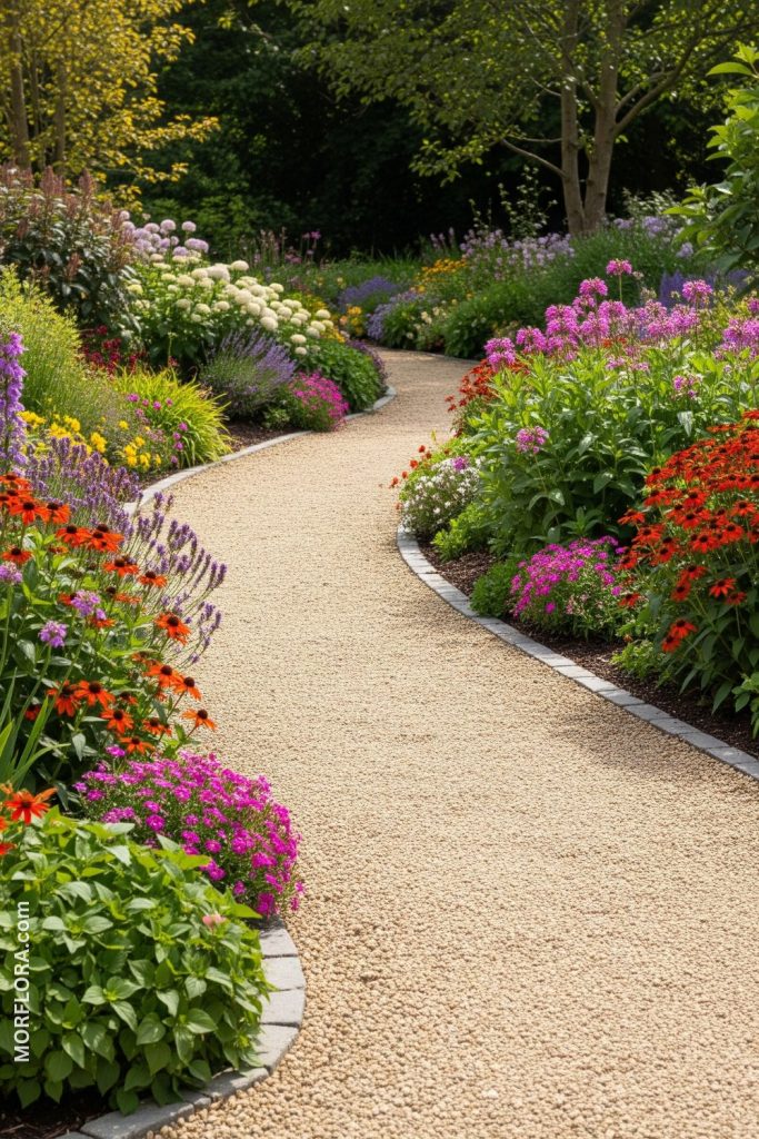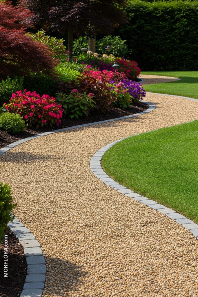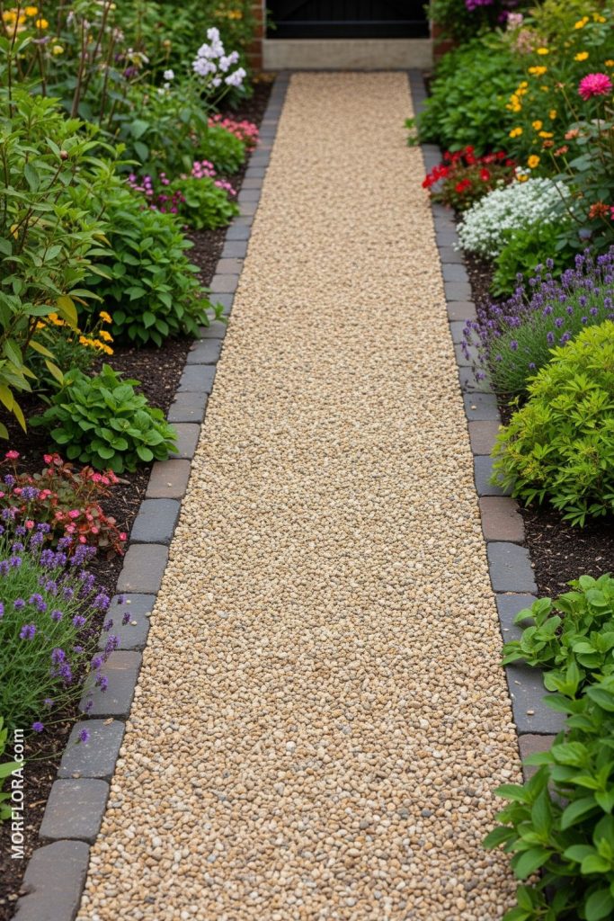 You can line your pea gravel walkway with flowering plants to add color and life. Choose flowers that bloom at different times to keep the path bright all year. This combination creates a soft, welcoming feeling for anyone walking through your garden.
