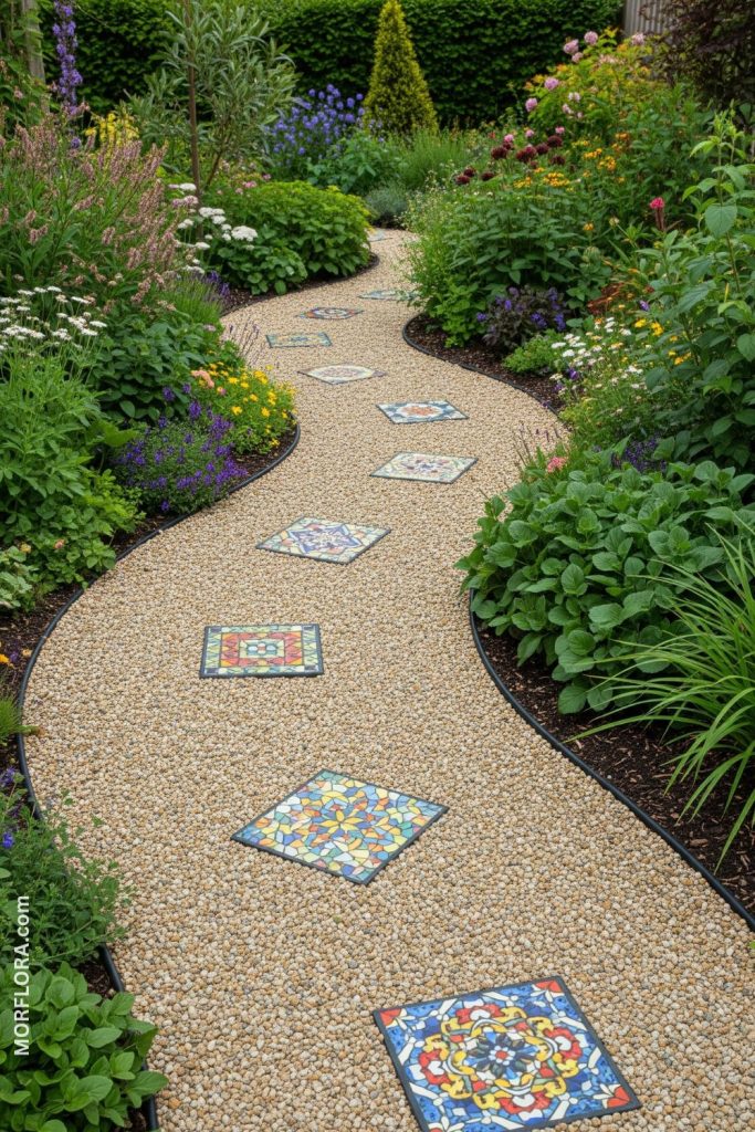 17. Pea gravel path with mosaic tile inserts
