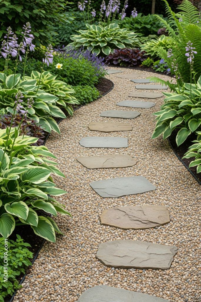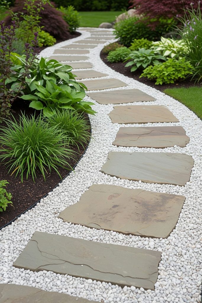You can create a beautiful walkway by placing flagstone slabs with pea gravel in between. The gravel fills gaps and makes walking comfortable. It also helps with drainage, keeping your path dry and easy to walk on. Choose gravel colors that match or contrast with your stones for a nice look.