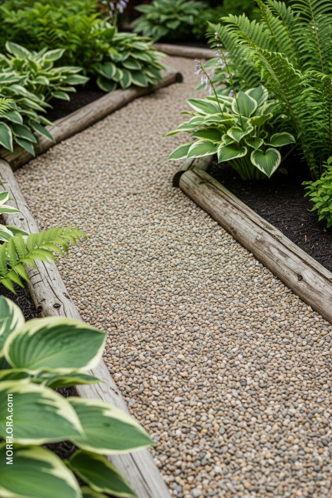 You can create a simple and charming path with pea gravel and wooden borders. The wood frames the gravel neatly, keeping it in place. This look fits well in most gardens, adding a natural feel that’s easy to maintain.