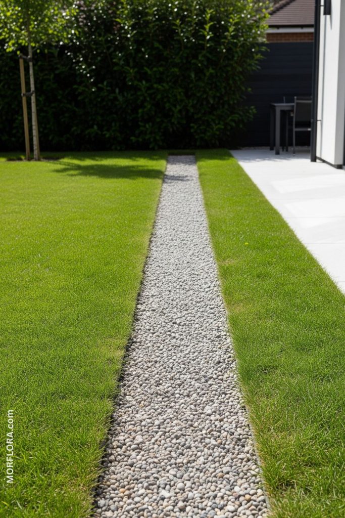 You can create a simple and clean look with a minimalist pea gravel strip path. It uses narrow lines of gravel between grass or concrete. This style fits well in modern gardens and is easy to keep neat.