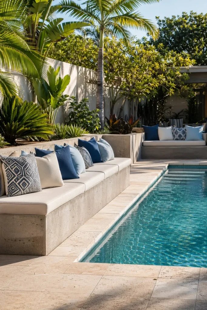 Built-in concrete benches keep the layout clean and permanent. Top them with tailored outdoor cushions in white, beige, or striped fabric for comfort and contrast. This is one of the smartest pool sitting area ideas if you want low-maintenance seating that still looks custom.