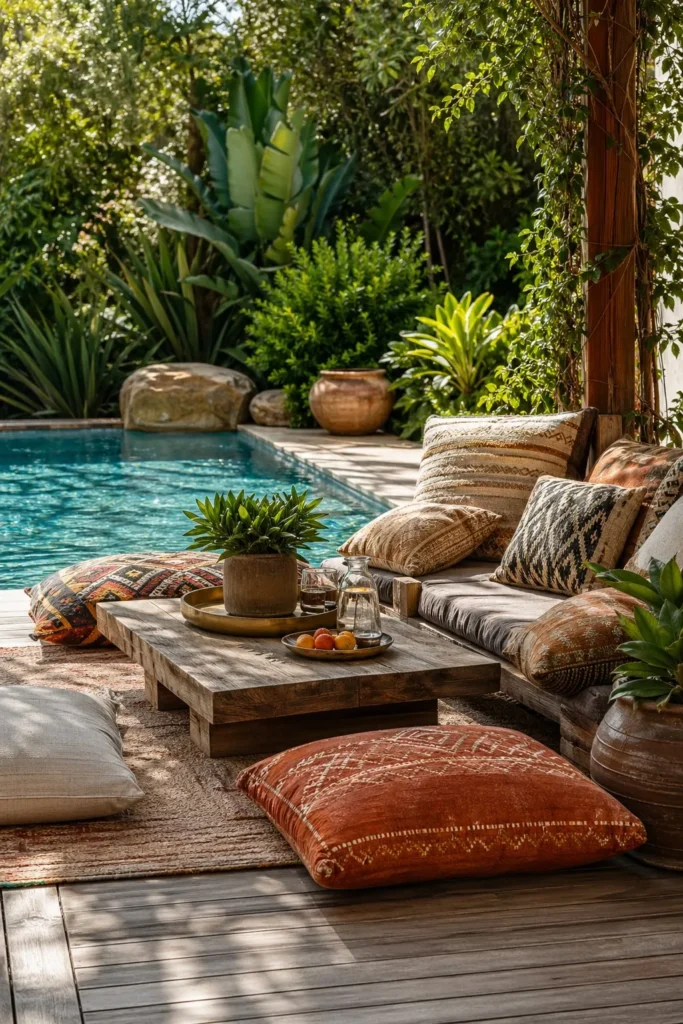 • 11. Boho Style Poolside Seating with Floor Cushions