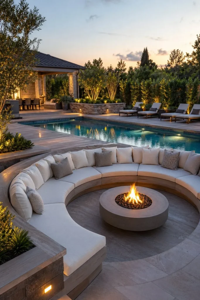 Curved sectionals soften hard deck lines and make a fire pit zone feel social. Choose modular pieces with plush cushions and durable fabric so the seating stays comfortable after sunset. This is one of the best pool sitting area ideas for entertaining larger groups.