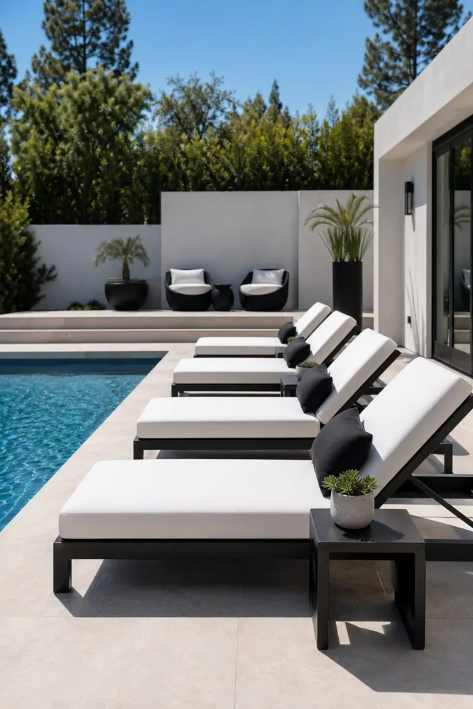 Black and white pool chairs create a sharp, modern contrast that photographs well and feels polished. Use black frames with white cushions, or reverse the combo for a lighter look. Add matching umbrellas or side tables to make the layout feel intentional.
