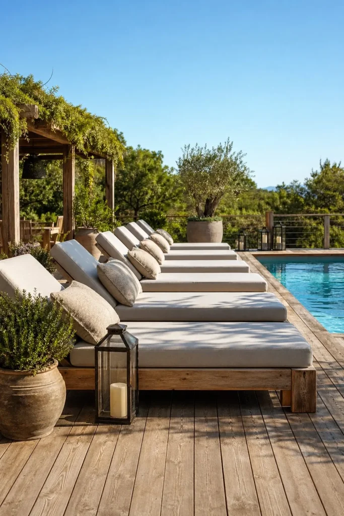Deep outdoor sofas with thick seat cushions make the deck feel more like a living room. Look for aluminum or teak frames with performance fabric that dries quickly. This setup is ideal if your pool deck is used as much for evening lounging as daytime swimming.