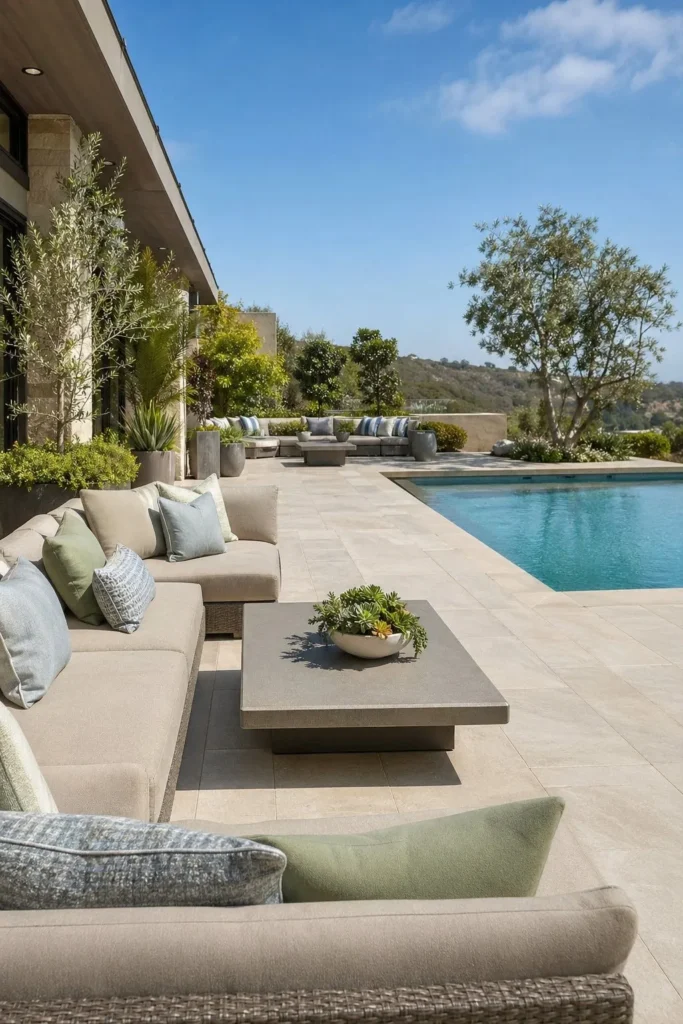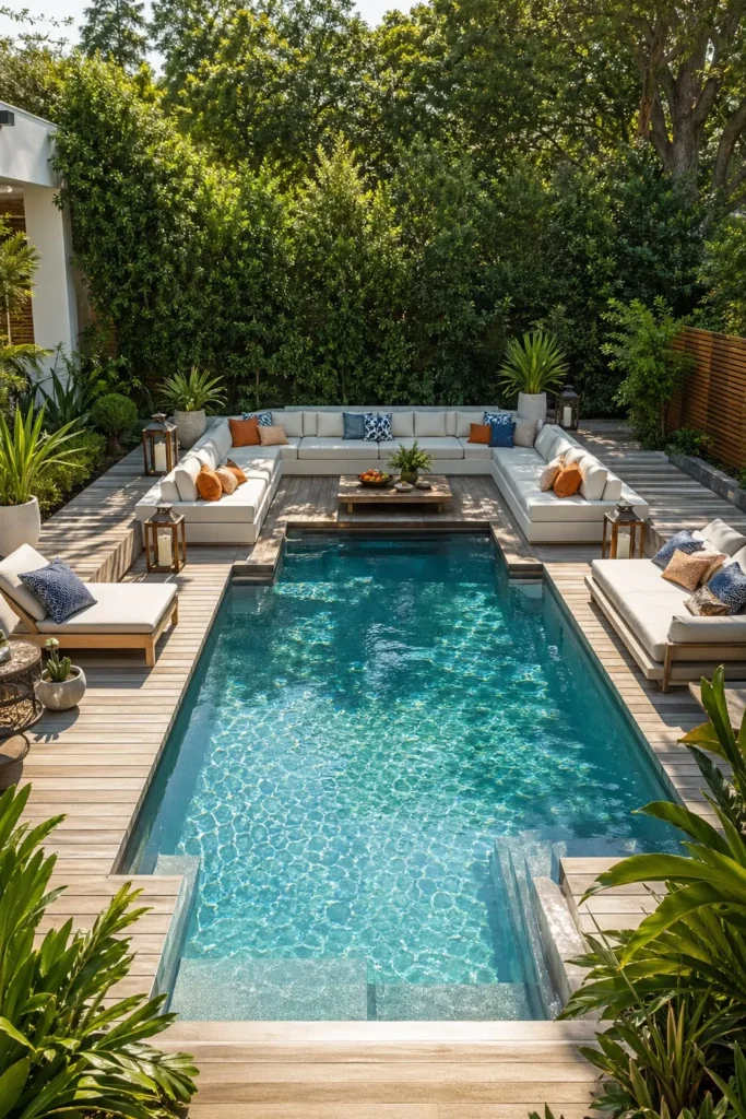 A U-shaped seating layout keeps conversation easy and gives everyone a clear view of the pool. Use sectional seating or built-in benches with thick cushions and a large center table. This arrangement is one of the most practical pool sitting area ideas for parties and family gatherings.
