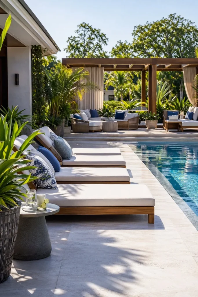 Combine the best elements, teak chaise lounges, a shaded daybed, deep outdoor sofas, umbrellas, and side tables with space for drinks and towels. Layer in planters, textured concrete or stone pavers, and soft outdoor cushions for a complete resort-style look. Save your favorite pool deck seating ideas and loungers to your Pinterest boards so you can build your dream setup one piece at a time.