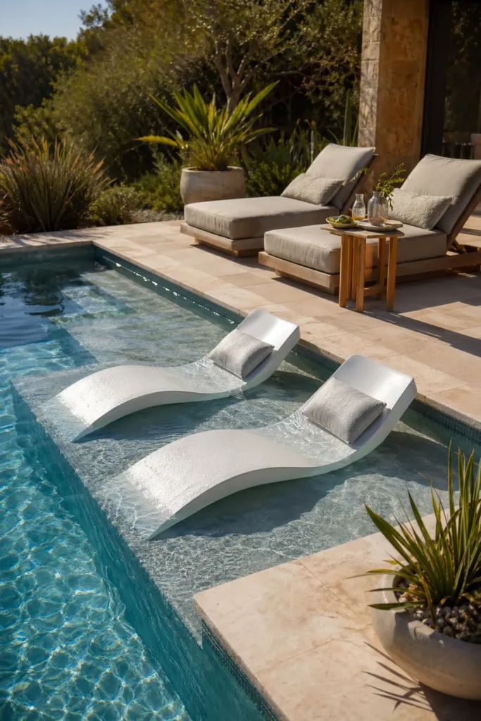 Choose molded resin or powder-coated aluminum sun shelf pool chairs made for shallow water. These in-pool loungers keep you cool while still giving you full-body support for tanning or reading. If you want standout outdoor pool area ideas, this is one of the best ways to make your pool feel custom.