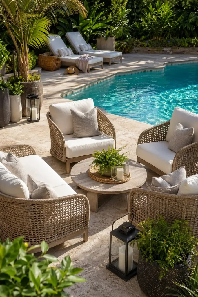 Mix floor cushions, poufs, woven chairs, and a low wood table for a laid-back boho setup. Stick with outdoor textiles, natural wood, and textured pieces like rattan or wicker. This look works best in covered areas or under shade sails near the pool.