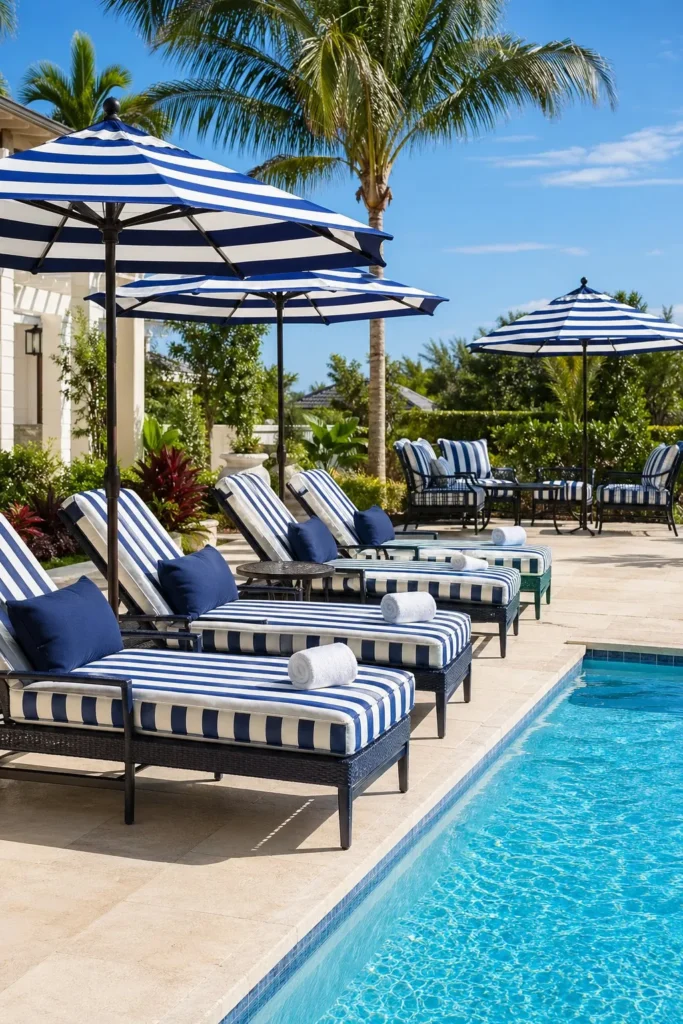 Blue and white striped cushions give your pool deck a crisp, coastal feel. Pair striped chaise lounges with white frames, navy umbrellas, and slim side tables for a clean cabana look. This style works well with white coping, pale pavers, and bright water.