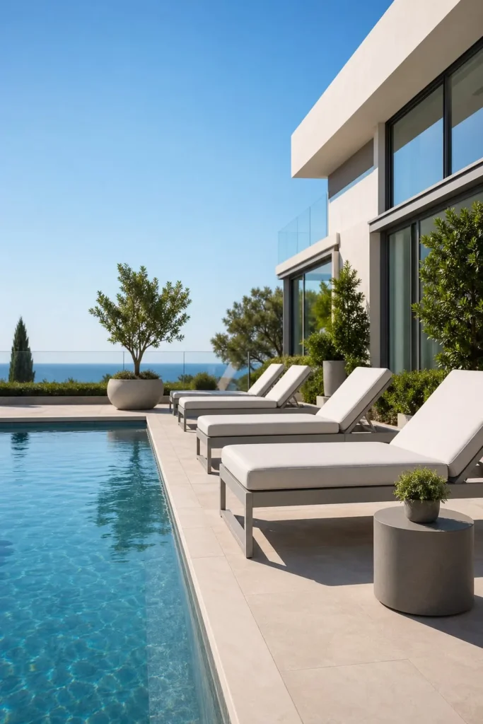 Pick low-profile pool lounge chairs with sharp lines, sling fabric, and powder-coated metal frames. Neutral shades like white, taupe, gray, or sand keep the deck looking calm and uncluttered. This is a smart match for modern homes with concrete, limestone, or large-format pavers.