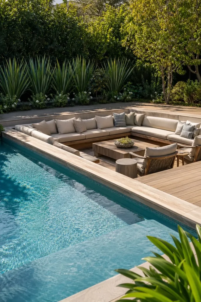 A sunken seating zone makes the pool area feel planned and private. Use built-in bench seating or modular sofas with deep cushions, then anchor the layout with a fire pit or central table. It is one of those outdoor pool area ideas that adds shape and helps separate lounging from swimming.