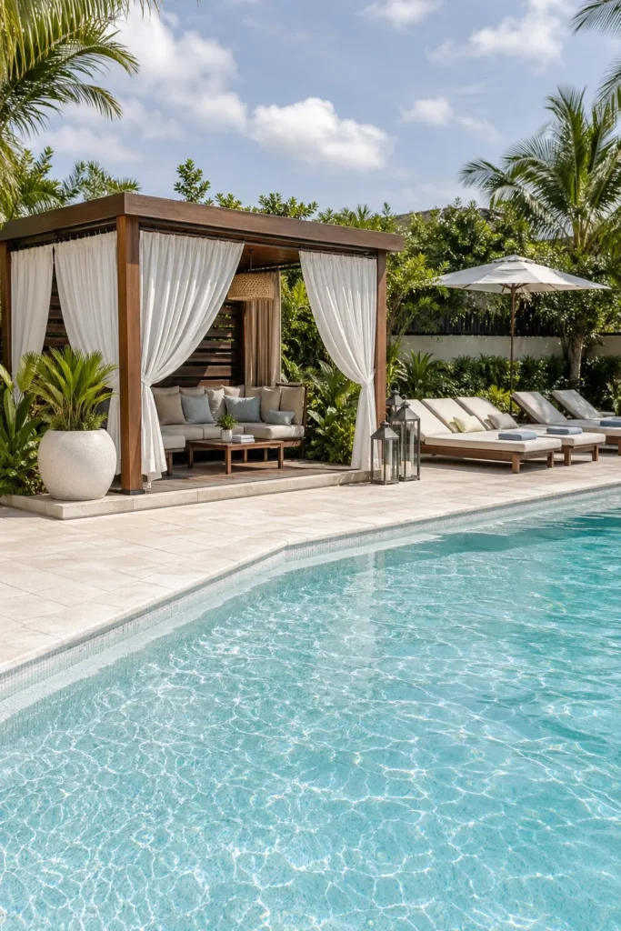 • 8. Stylish Poolside Cabana with Curtained Seating