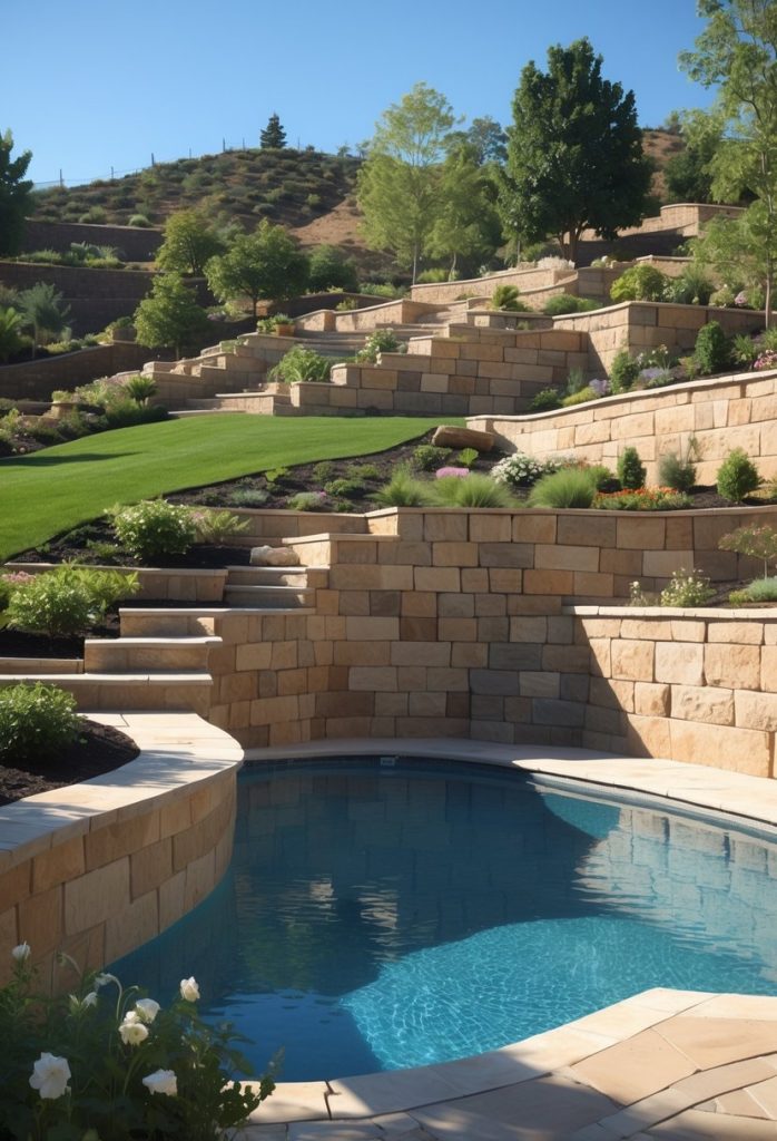 You can use stone masonry to build strong retaining walls around your hillside pool. These walls help hold back the slope and create a safe, flat area for your pool. Plus, stone adds a natural, timeless look that fits well with outdoor spaces.