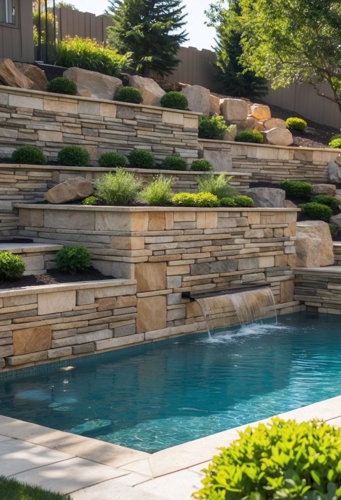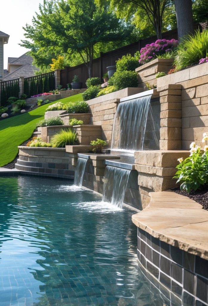 5. Retaining walls with built-in waterfalls flowing into the pool