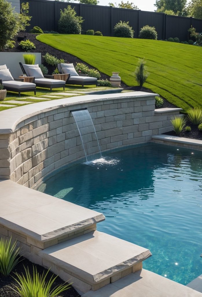 You can use curved retaining walls to shape the edge of your infinity pool. These walls help hold back soil while adding a smooth, natural look to your pool area. They also create a soft, flowing design that blends well with your sloped yard.