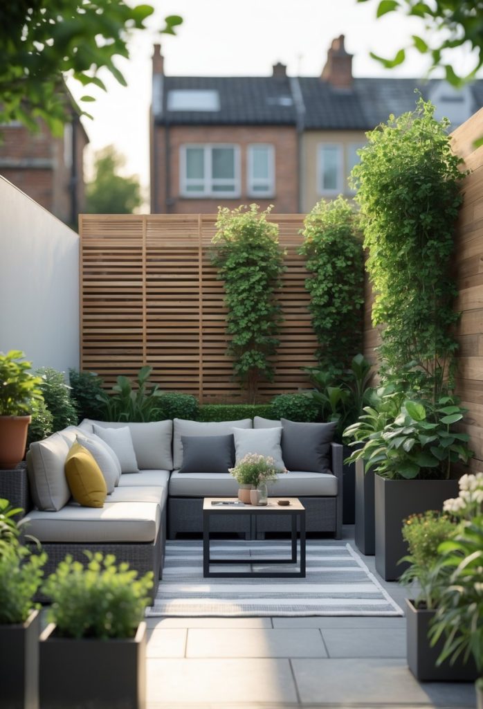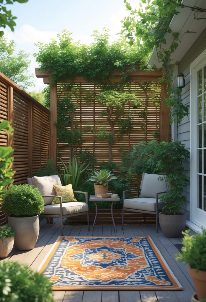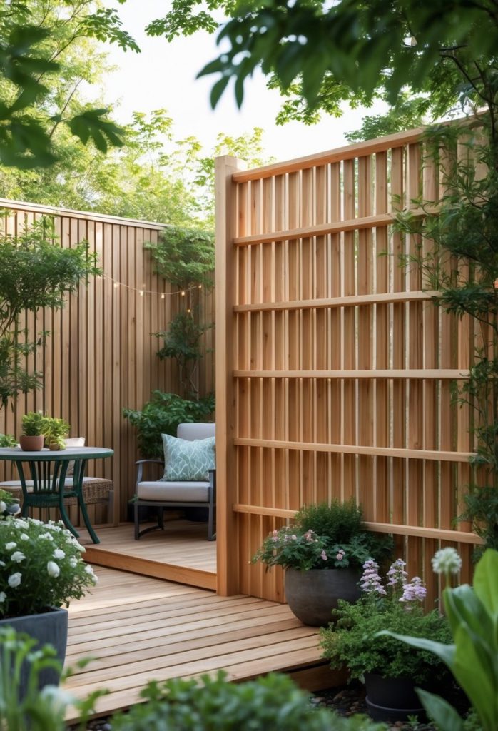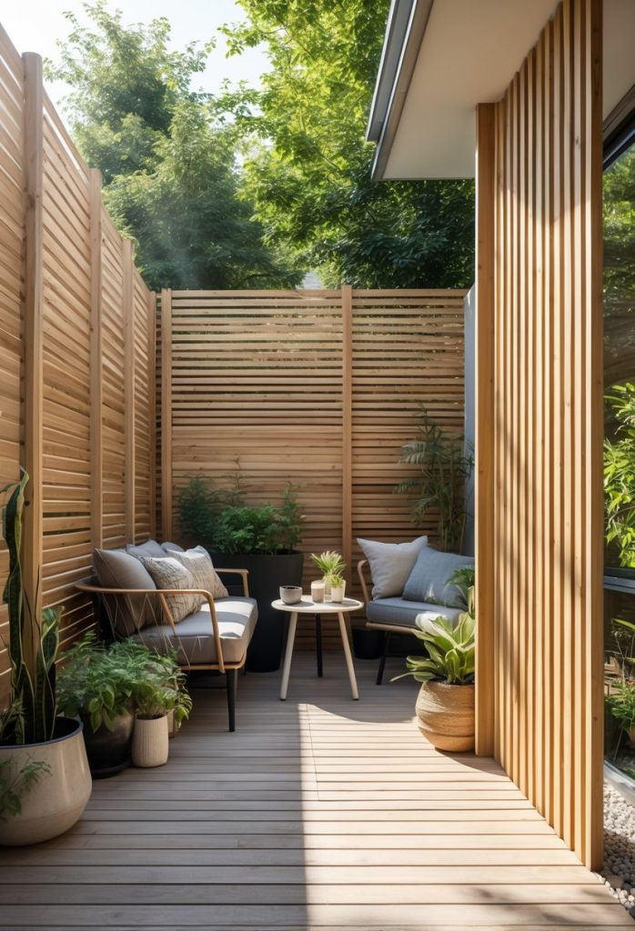 You can add privacy with wooden slatted screens in your outdoor space. They let light and air pass through while blocking views.
