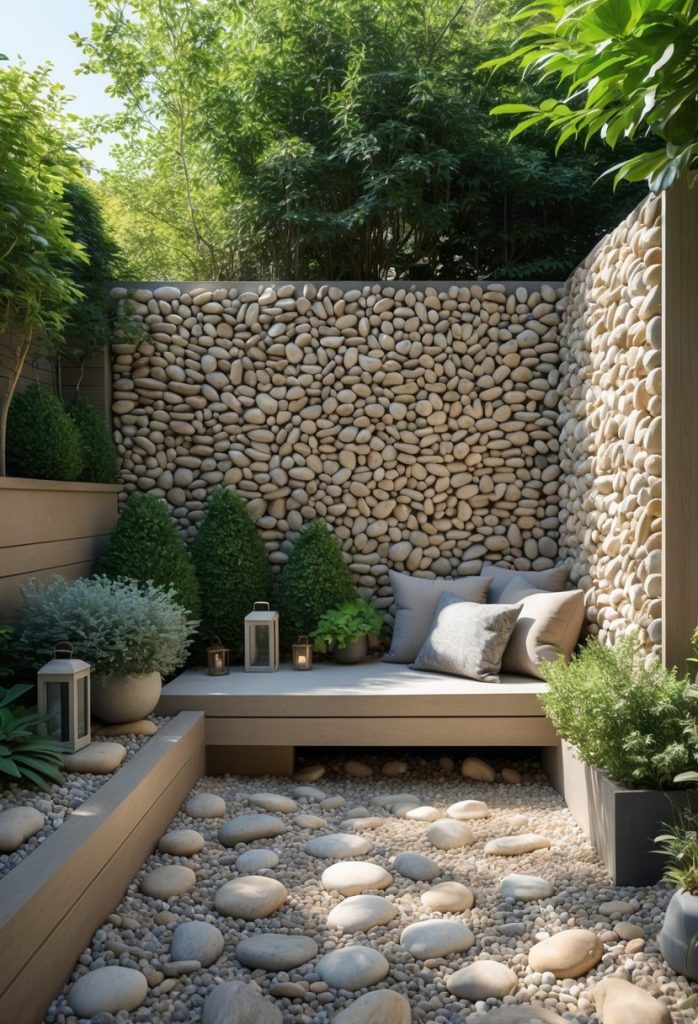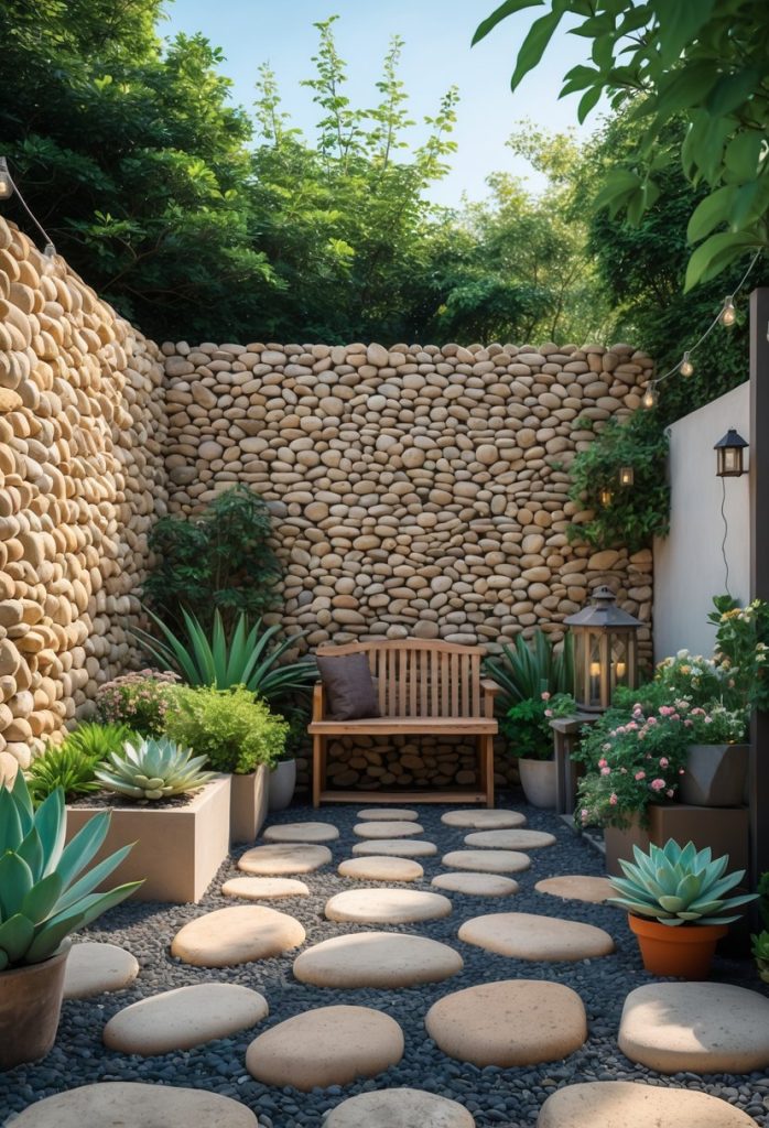 You can create a pebble-lined wall to add privacy and style to your outdoor space. The pebbles give a natural, calm look while blocking views from neighbors. Adding lights nearby helps make shadows and depth, giving your area a cozy feel at night.