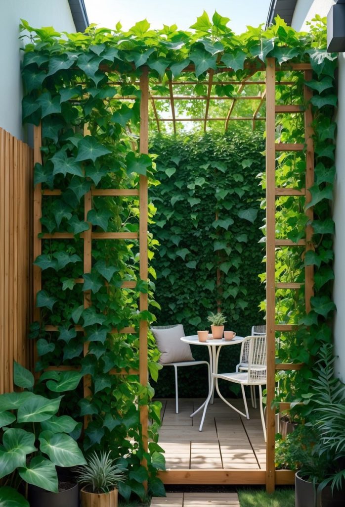You can quickly add privacy by growing fast-growing ivy on a trellis. Choose types like Virginia Creeper or Boston Ivy for quick coverage. They climb easily and create a natural screen. Just set up your trellis and guide the ivy as it grows.