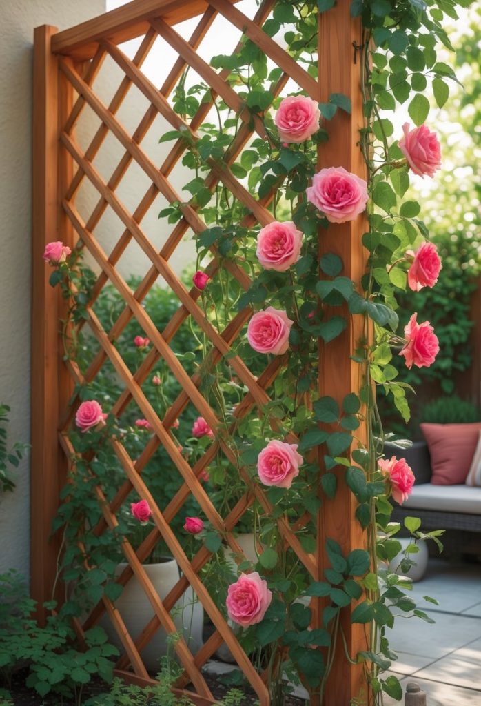 You can add privacy and beauty by installing cedar lattice panels. Climbing roses grow well on the lattice, creating a natural, colorful screen. Cedar wood lasts outdoors and resists moisture, so it holds up well over time. This setup gives your small outdoor space a cozy feel without blocking light.