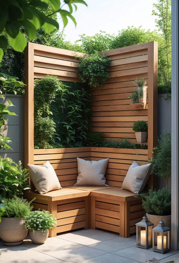 You can build a wooden corner bench that gives you both seating and privacy. Place it in a tight spot to block views while making good use of space. Adding tall back panels can help shield your area from neighbors.
