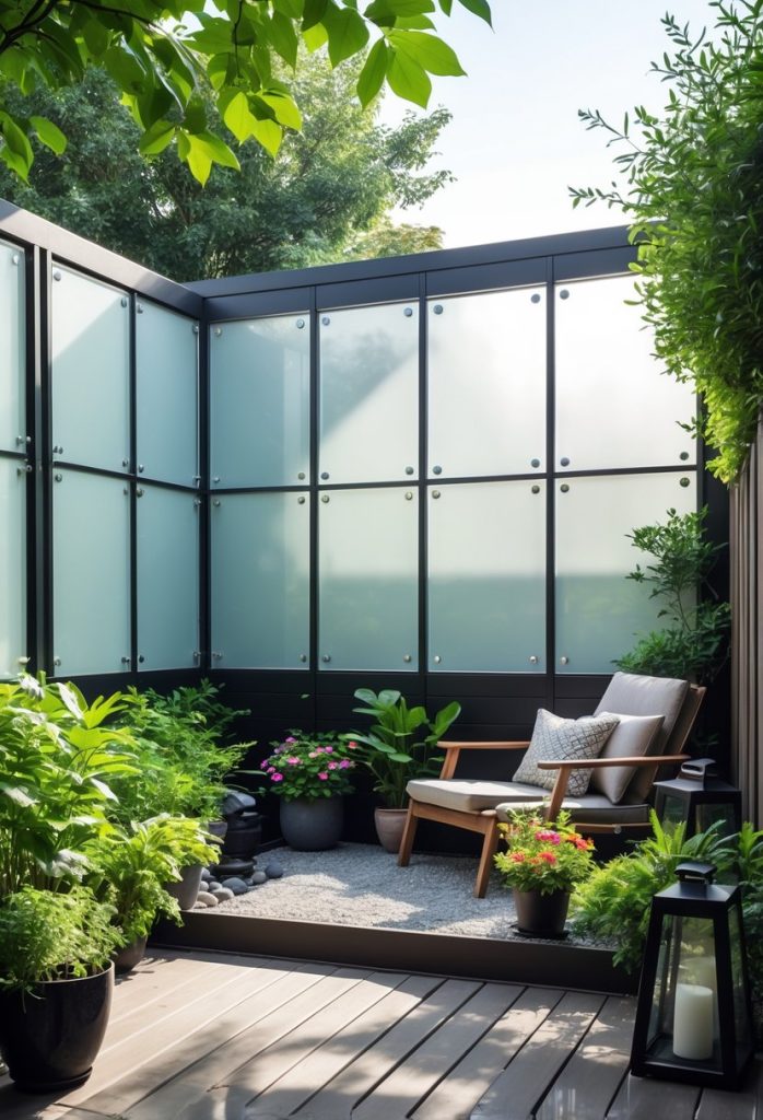 You can use frosted glass panels to create a fence that lets light in but keeps your space private.